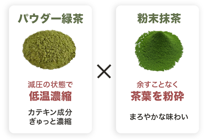 パウダー緑茶は、減圧の状態で低温濃縮し、パウダー化することで、カテキン成分をできるだけ多く保っています。