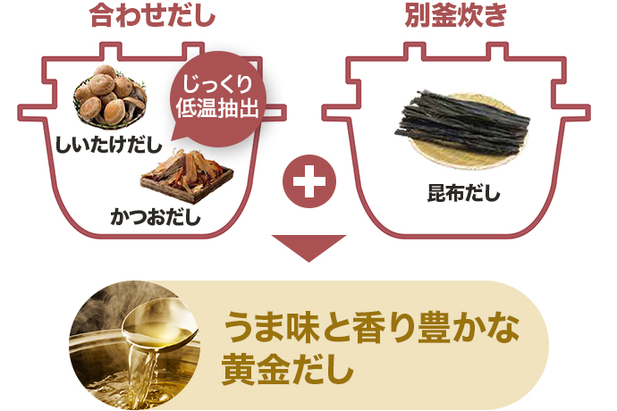3種類の素材を活かす「3種の合わせ黄金だし製法」