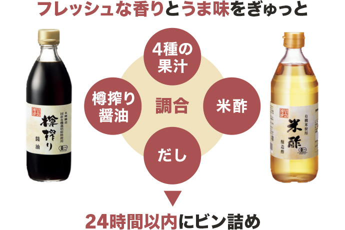 フレッシュな香りとうま味を閉じ込めるため、4種の果汁に、樽搾り醤油、米酢、だしを加えたら味の質が落ちない24時間以内に、ビン詰めをします。