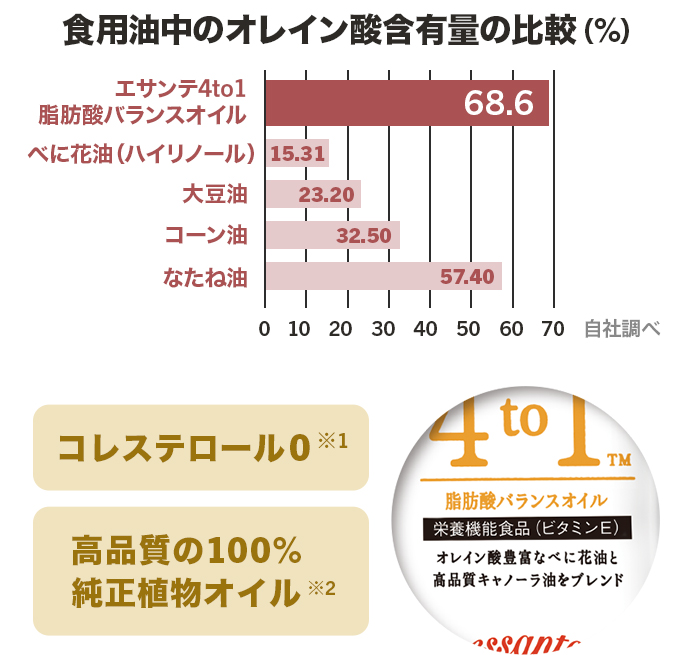 エサンテ™4to1脂肪酸バランスオイルが酸化に強い理由の一つは、酸化しにくいとされるオレイン酸を約70%も含んでいること。一般的にお料理に使われるべに花油、コーン油の2倍以上も含んでいます。