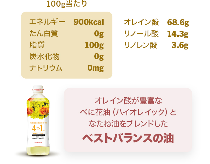 オレイン酸が豊富な「べに花油」とハイグレードな「キャノーラ(菜種)油」を使用した、ヘルシーなこだわりの植物油。サラッとライトな味わいで幅広い料理に使えます。オメガ6系脂肪酸とオメガ3系脂肪酸が、望ましい比率の「4:1」で配合されています。これは厚生労働省「日本人の食事摂取基準」(2005年版)で目安とされる摂取割合です。