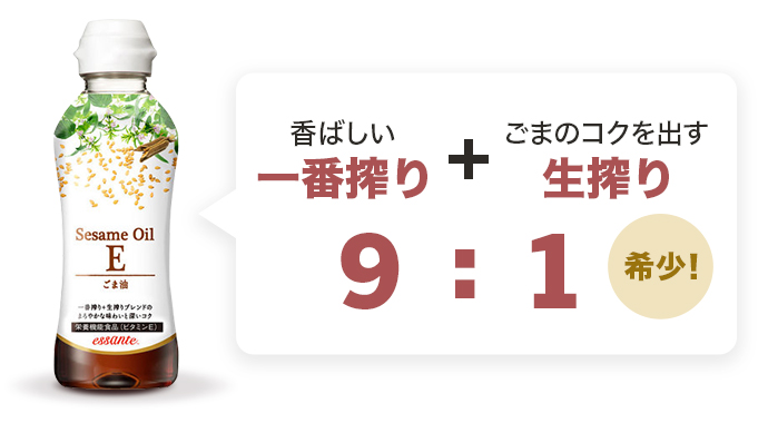 まろやかな味わい、深いコク、豊かな香り。一番搾りごま油と生搾りごま油を9:1でブレンドしたごま油。ビタミンEとその働きを助けるといわれるごまリグナンを含有。